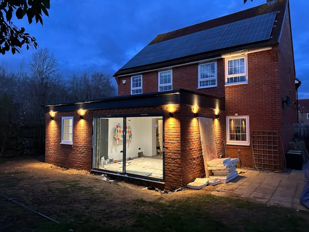 A single storey rear extension to a new build property. The project requires the removal of a small glazed conservatory feature to enable a larger rear, open plan extension to the existing dining and kitchen spaces. The new roof will overhang to provide solar shading whilst also including a strip rooflight to allow natural light back into the existing house.
